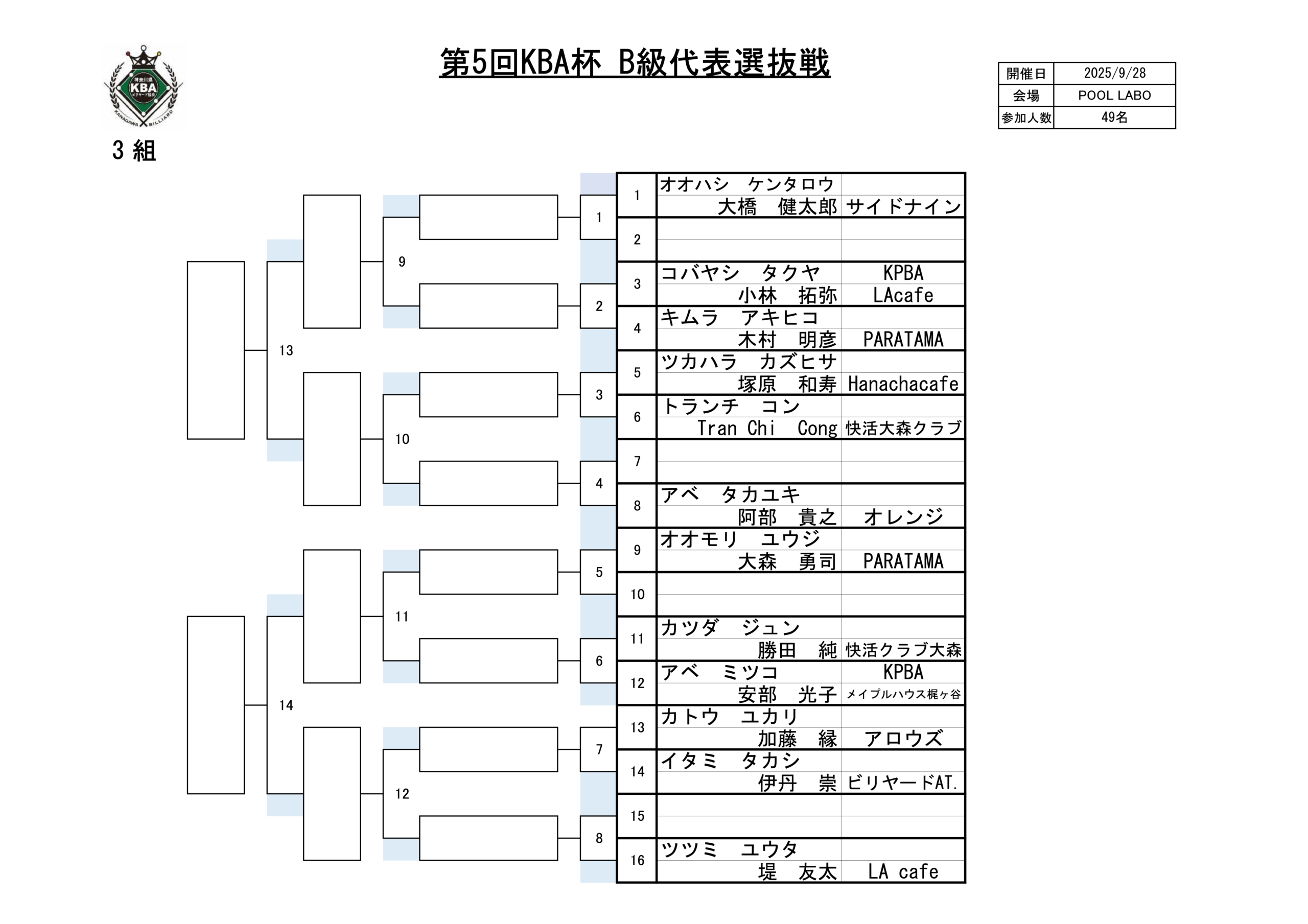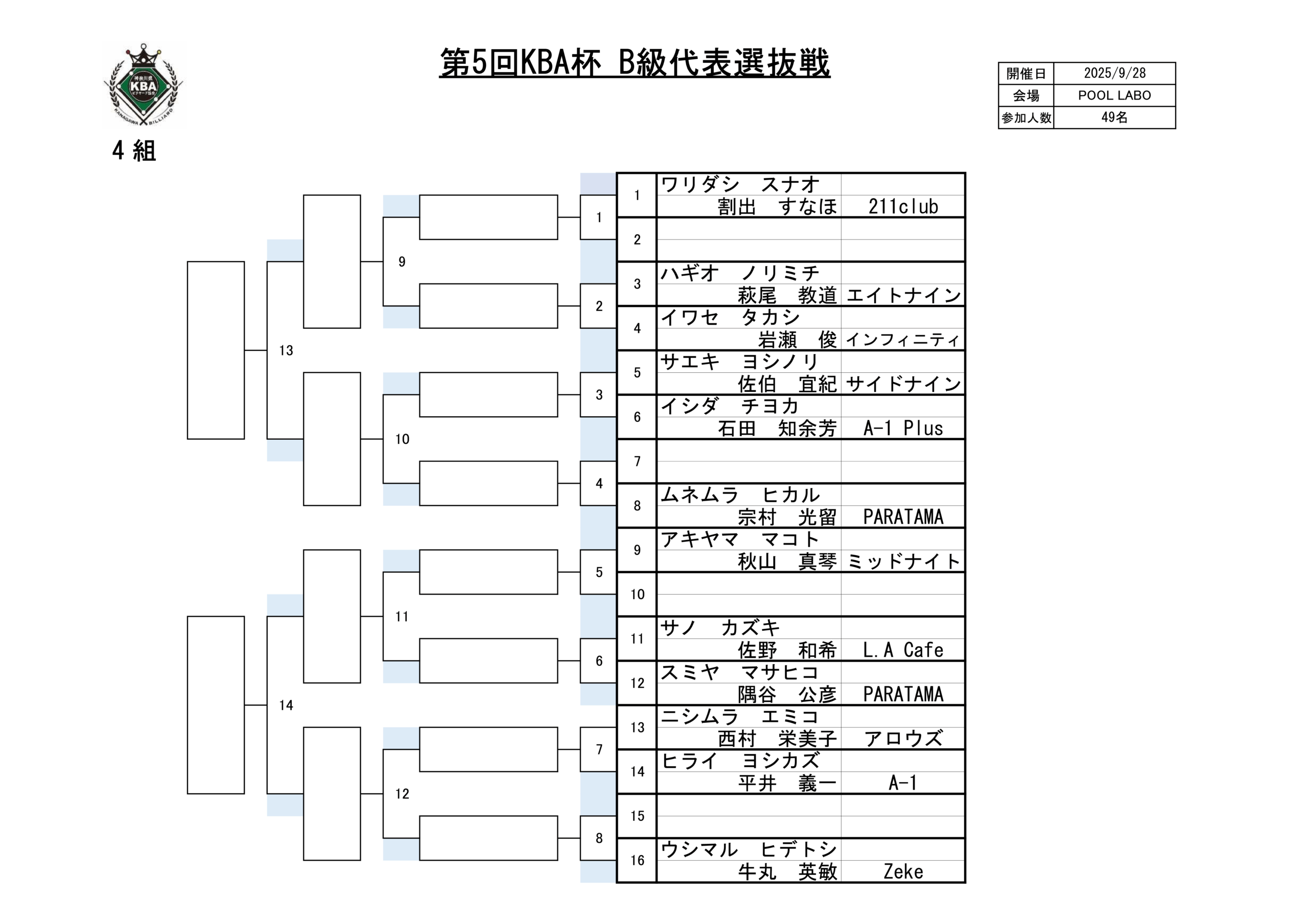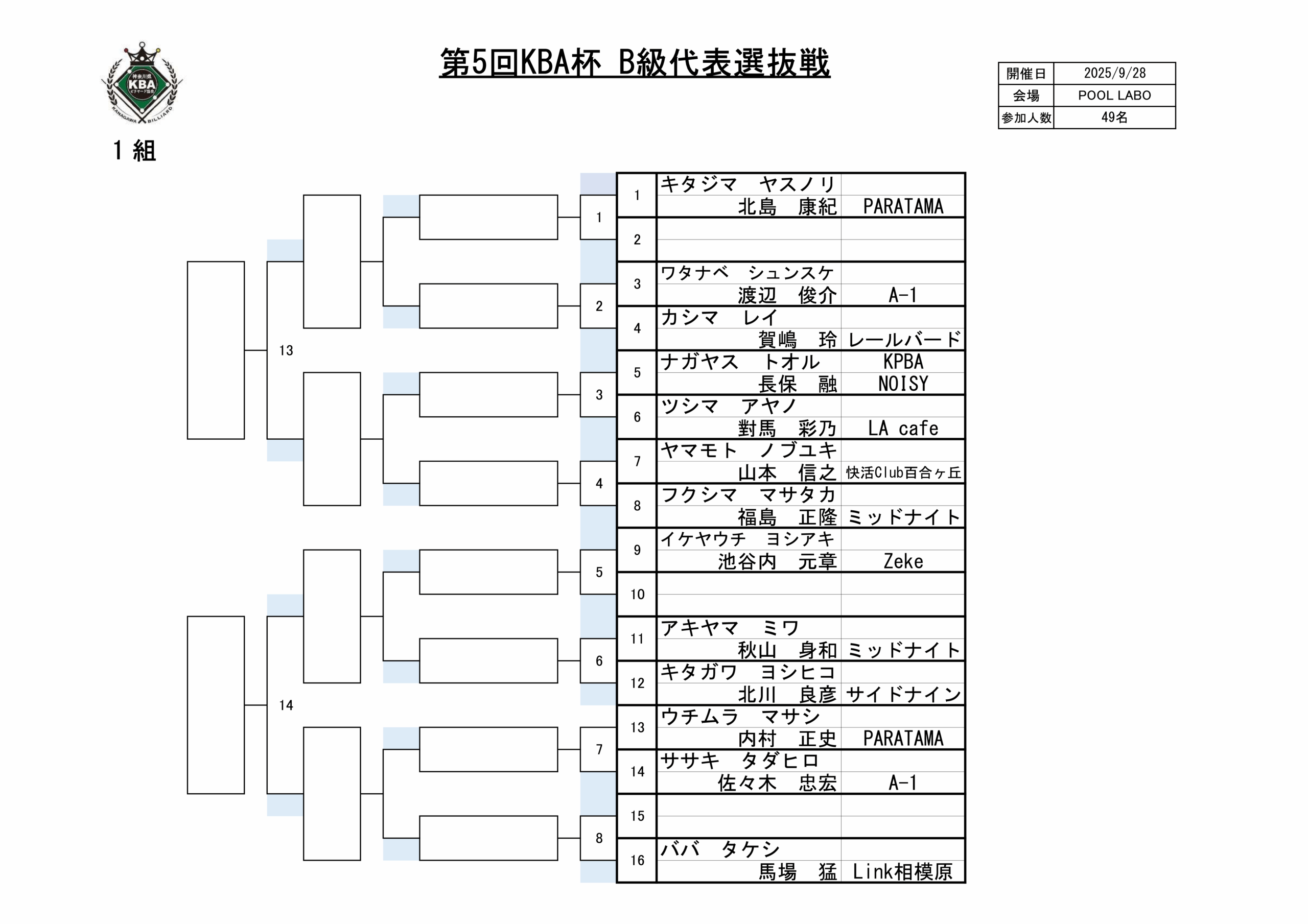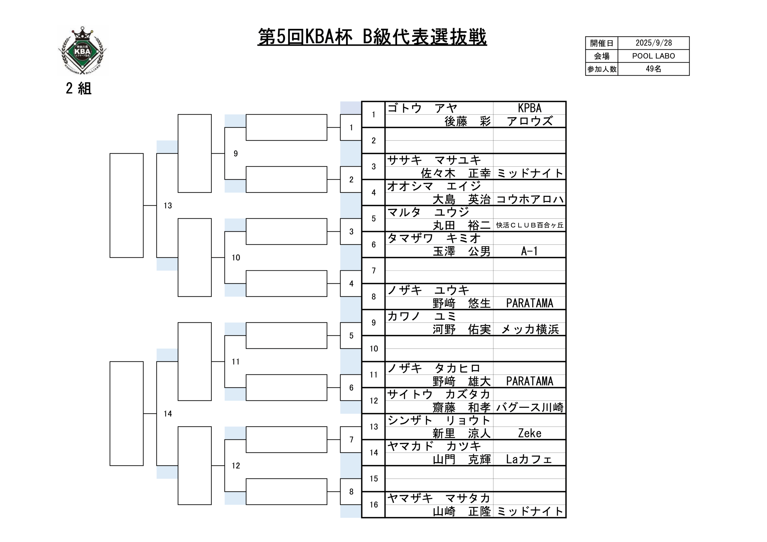 <対戦表>9/28(日)第5回 KBA杯 B級神奈川代表選抜戦