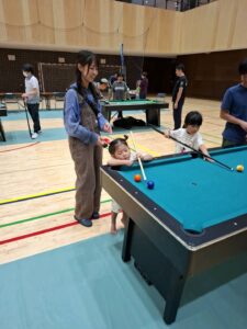アリーナ内にはミニビリヤード台を5台設置し、子どもから大人まで幅広い世代の方々にビリヤードを体験していただきました。