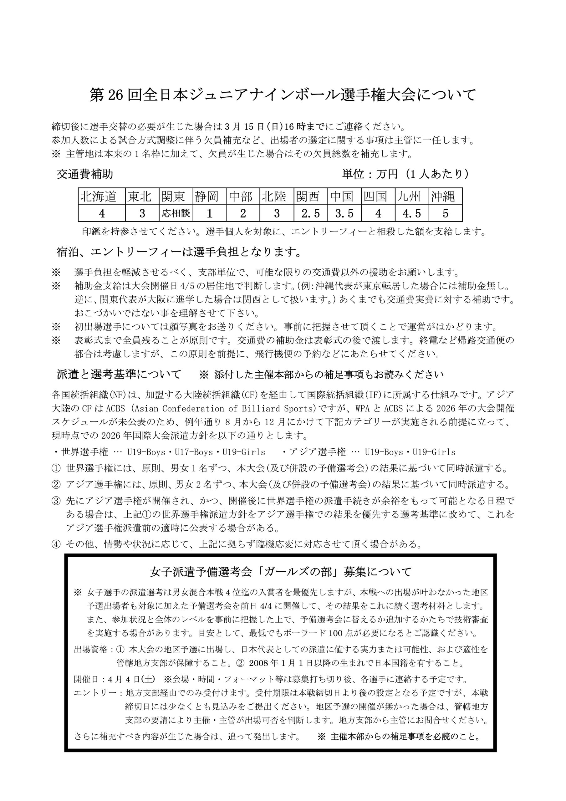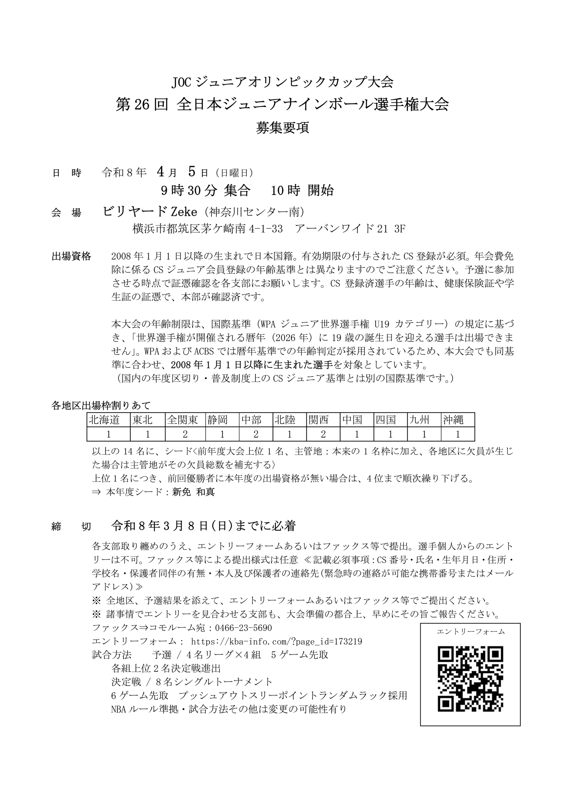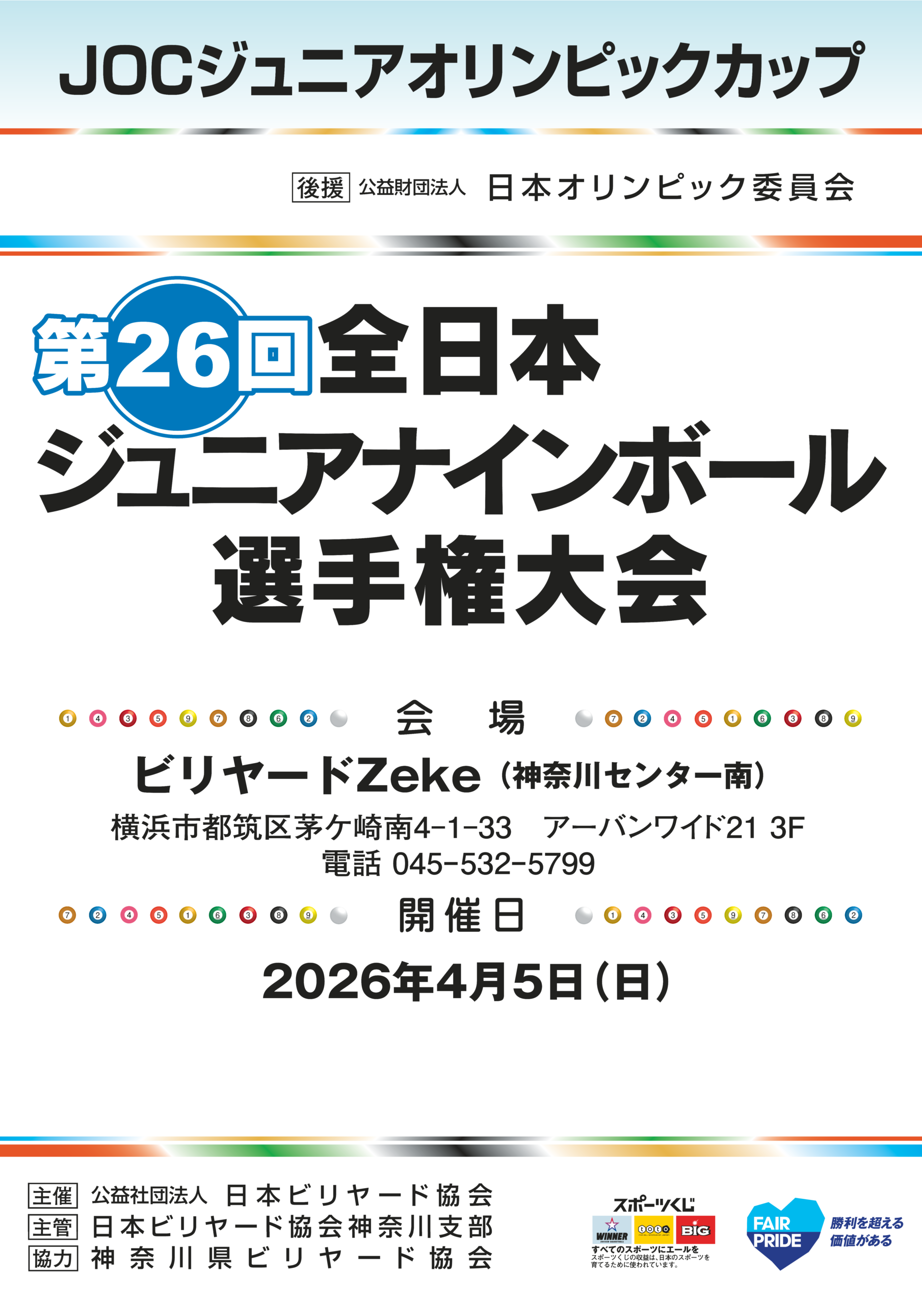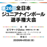 2025年12月18日 / 最終更新日時 : 2025年12月18日 admin ポケット 第26回 全日本ジュニアナインボール選手権大会 要項 以下をアップしました。 ・本戦の大会要項 ・ガールズの大会要項 ・関東地区代表決定戦の大会要項 ■本戦の大会要項 ■ガールズの大会要項 ■関東地区代表決定戦の大会要項