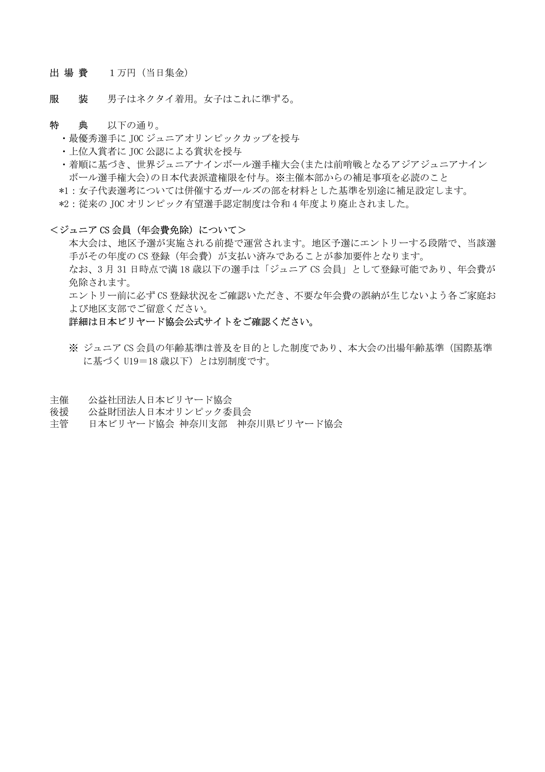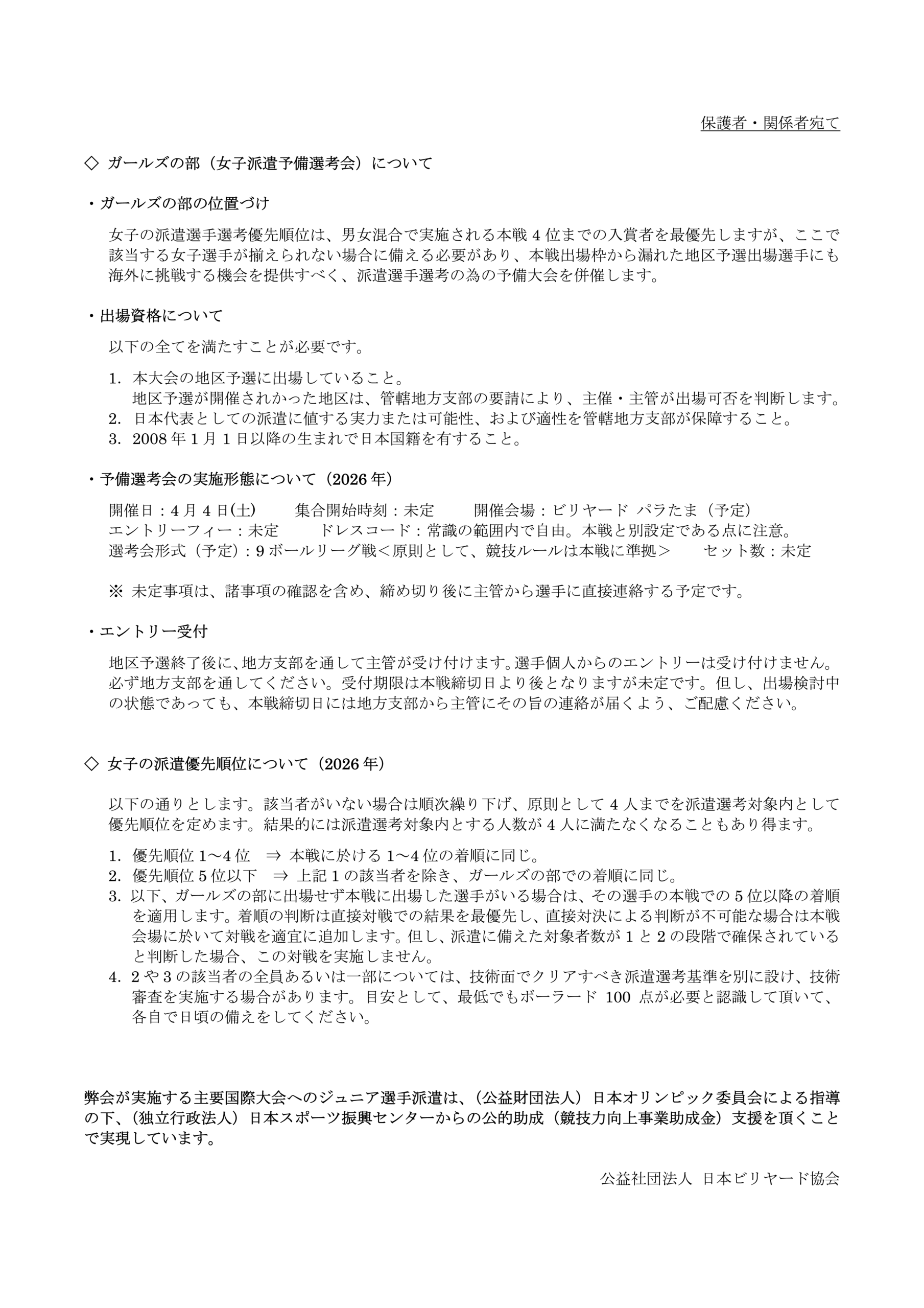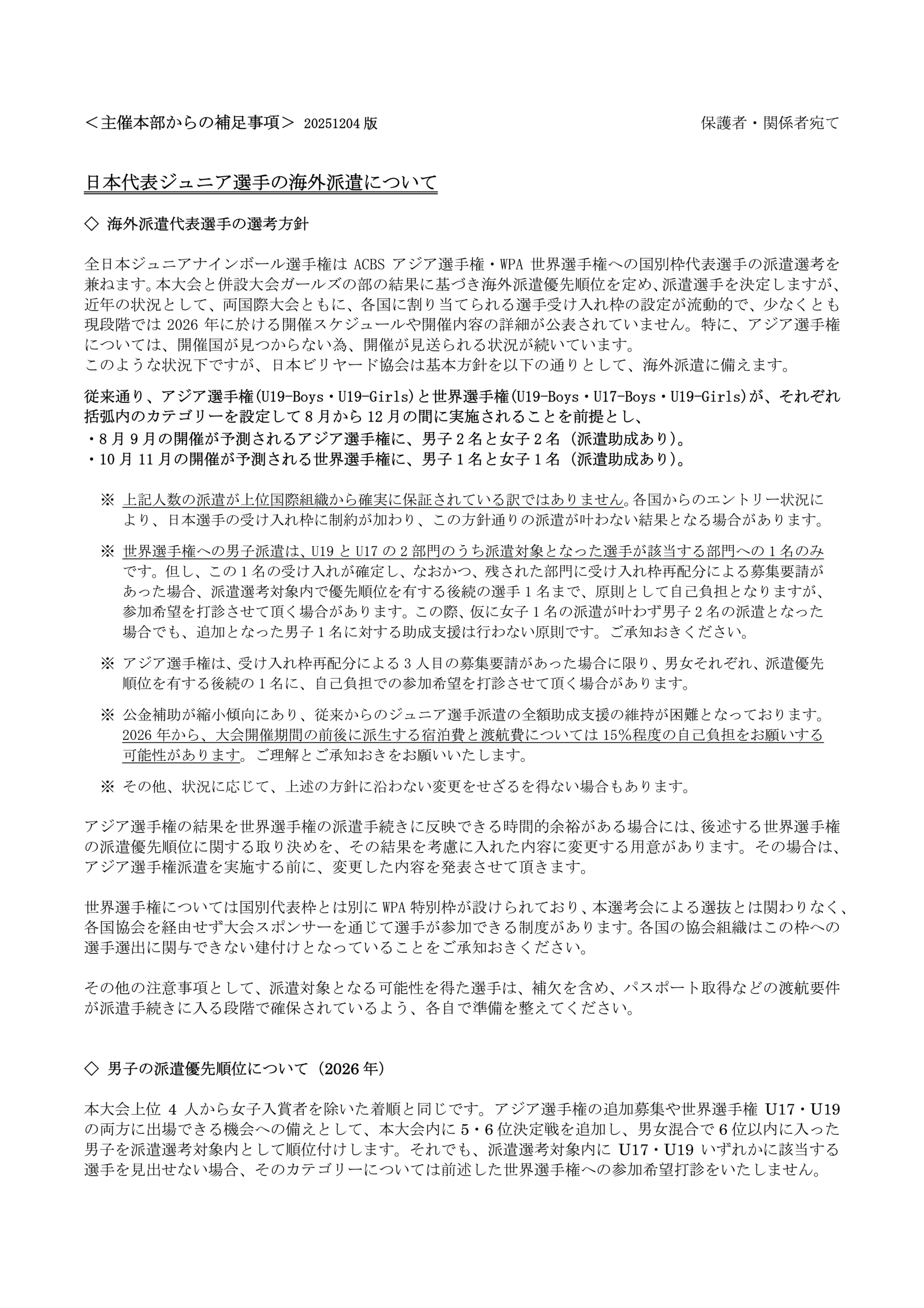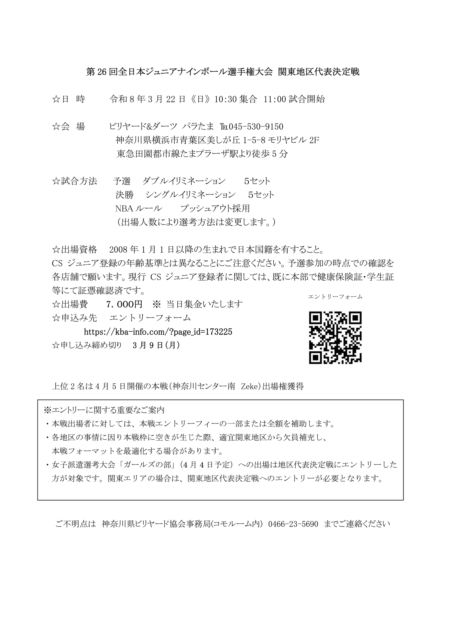 2025年12月18日 / 最終更新日時 : 2025年12月18日 admin ポケット 第26回 全日本ジュニアナインボール選手権大会 要項 以下をアップしました。 ・本戦の大会要項 ・ガールズの大会要項 ・関東地区代表決定戦の大会要項 ■本戦の大会要項 ■ガールズの大会要項 ■関東地区代表決定戦の大会要項