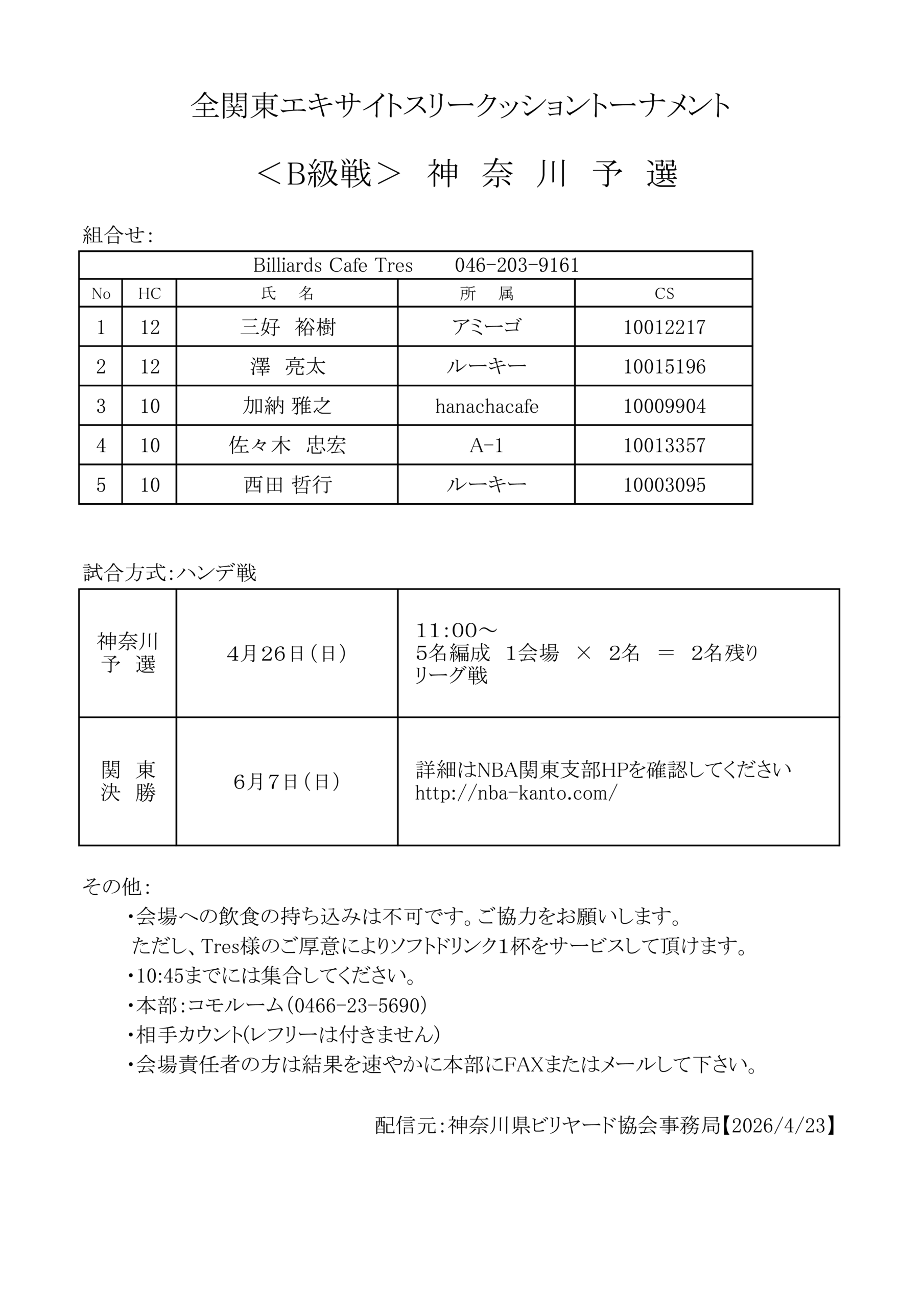 <出場者組み合せ>春季 全関東エキサイト3CトーナメントB級 神奈川予選